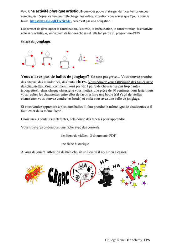 Bonjour à tous, en ce temps de confinement il est important de garder une activité physique quotidienne pour limiter les effets de la sédentarité. L'OMS recommande au moins 30' d'activité physique par jour en alternant un jour sur deux, un travail de renforcement musculaire et un travail d'endurance. Ci-joint un document qui va vous aider à conserver cette activité physique chez vous. Je vous rappelle la nécessité de respecter les règles de sécurités :s'échauffer avant de commencer, avoir un espace suffisant pour ne pas se cogner et respecter les distances barrières (pas à moins d'1m) si vous sortez pour faire votre activité d'endurance. Je vous joins aussi un carnet d'entraînement pour que je puisse avoir un suivi de votre activité et que vous puissiez voir vos progrès (il y a un challenge où vous devrez faire mieux la deuxième semaine de travail que la première).Si jamais vous ne savez pas quel niveau choisir au début ou si vous avez des problèmes de dos, d'asthme,... n'hésitez pas à me contacter pour que je vous conseille ou que je vous adapte le travail. Remplissez bien la partie ressenti elle vous permettra de voir l'adaptation de votre corps à l'effort, et me permettra de vous adapter le travail si jamais c'est trop facile ou trop difficile.Bon courage à vous. Cordialement l'équipe EPS.