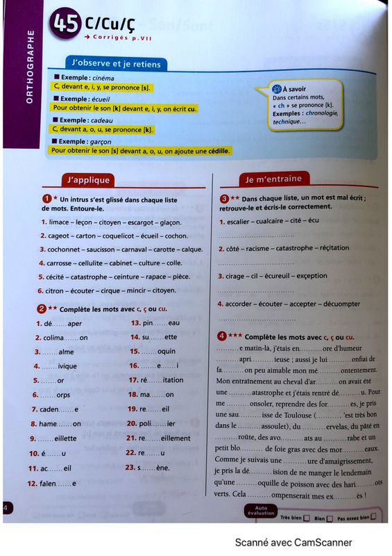 1) Corriger la fiche concernant "c, cu, ç" et réviser la règle.