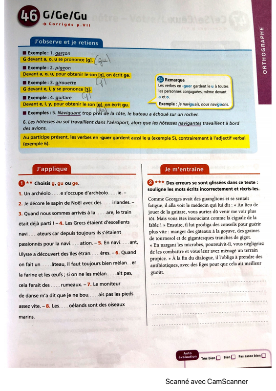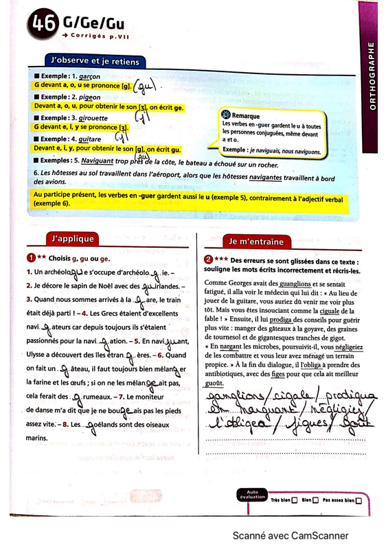 1) Corriger la fiche concernant "g, ge, gu" et réviser la règle. Si vous avez fait plus de trois fautes au total, refaites les exercices.