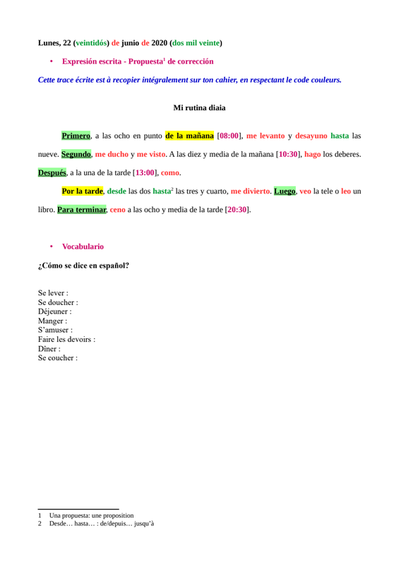 1. Recopier la correction de l'expression écrite en respectant le code couleurs.