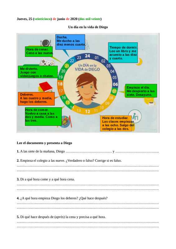 1. Répondre aux questions du document "Un día en la vida de Diego" en veillant à construire des phrases complètes.